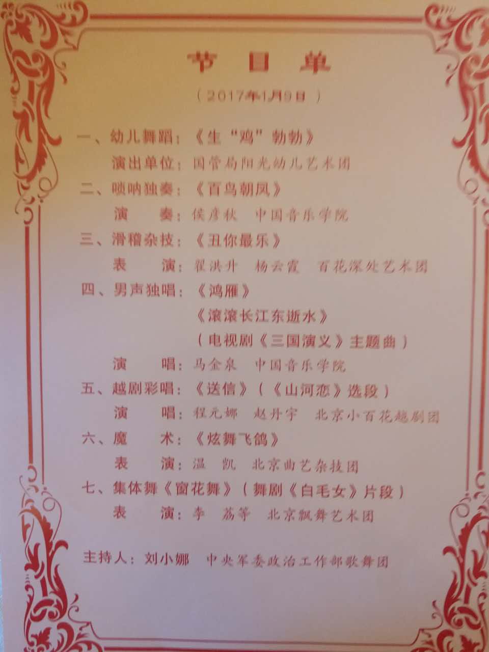 2017年元月9日上午10:00,政协新春茶话会在政协礼堂举行。全国政协领导出席会议。百岁革命老人王定国应邀参加会议。中国知青芭蕾舞团表演了《窗花舞》,演出非常成功。中国知青芭蕾舞团名誉团长王进江参加了活动并对中国知青芭蕾舞团祝贺:“祝贺管锦红老师幸勤耕耘!祝贺飘舞连续三年登上全国政协春晚舞台,作为名誉团长为你们高兴,为中国知青芭蕾舞团喝彩!”