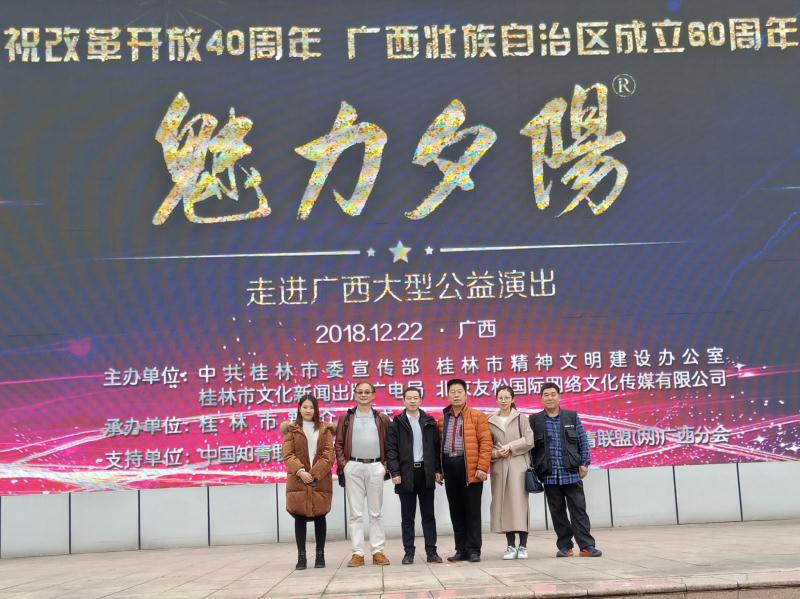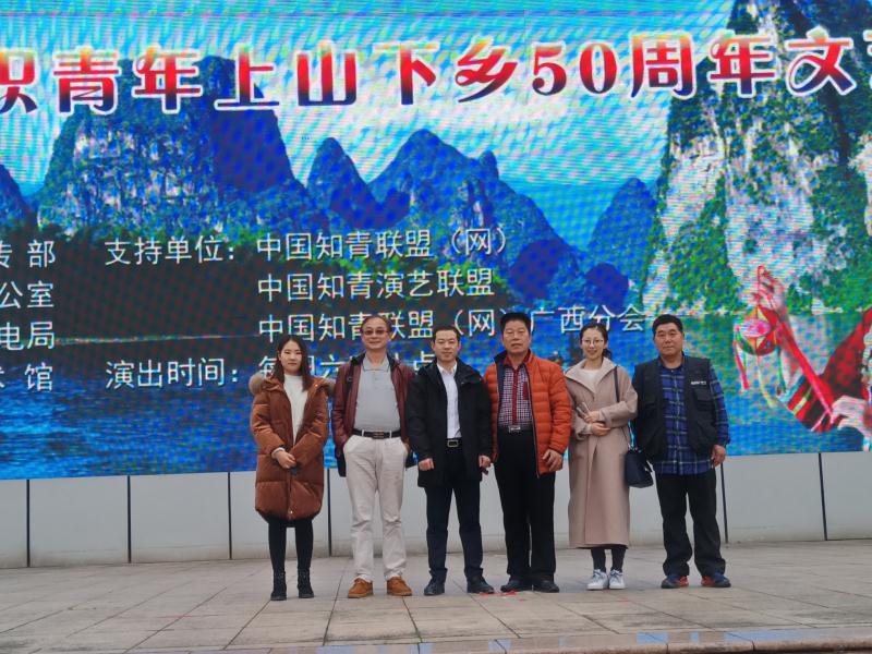 今天的这场演出,是全国各省市:“纪念知识青年上山下乡50周年文艺演出”中的一场,新华社,人民日报,CCTV我爱你中华网络电视频道《知青》栏目组和中国知青联盟(网),中国知青演艺联盟,中国知青联盟(网)广西分会,北京友松国际网络文化传媒有限公司和桂林电视台,桂林日报,桂林晚报等媒体都有记者来宣传和报道,对他们的到来我们表示衷心的感谢!