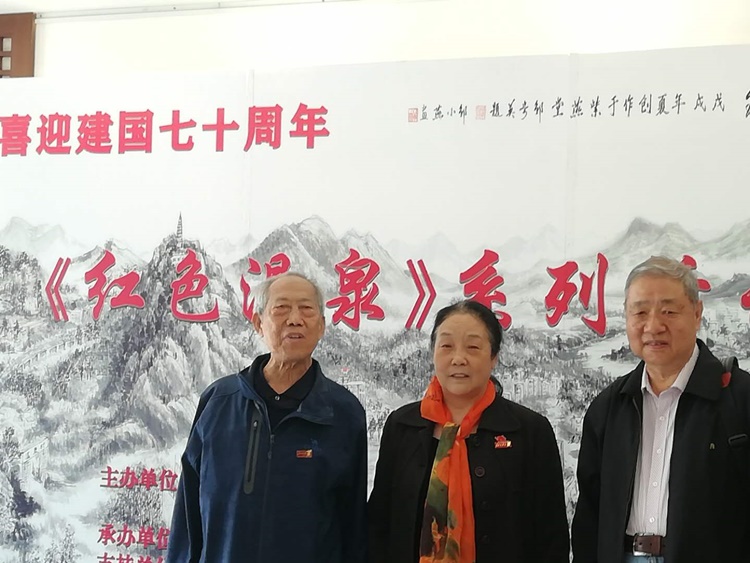 会议开始前中国知青联盟理事长王进江与天津师范大学马克思主义学院教授郝贵生及中国毛泽东研究院院长、中国红色征程研究会会长杨沫先生之子马青柯在红色温泉系列活动宣传栏前合影。