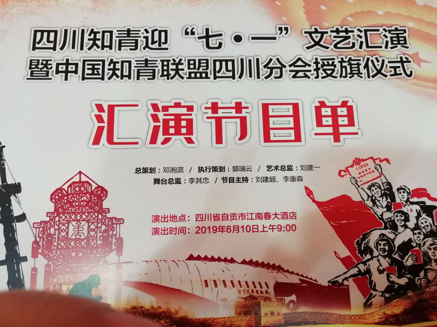 2019年6月9日--10日在四川省自贡市江南春大酒店召开了四川知青迎“七·一”文艺汇演暨中国知青联盟四川分会授旗仪式。中国知青联盟理事长王进江、秘书长姜飙从北京专程赶到自贡参加了此次知青纪念党的98周年生日活动。