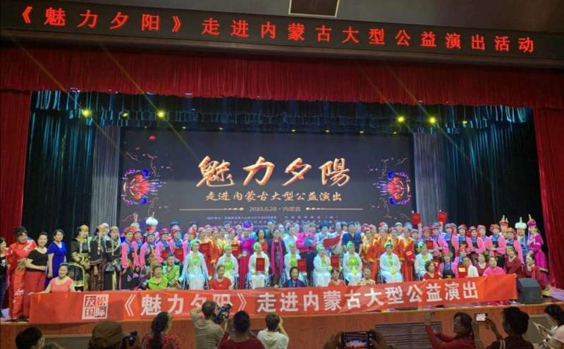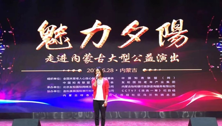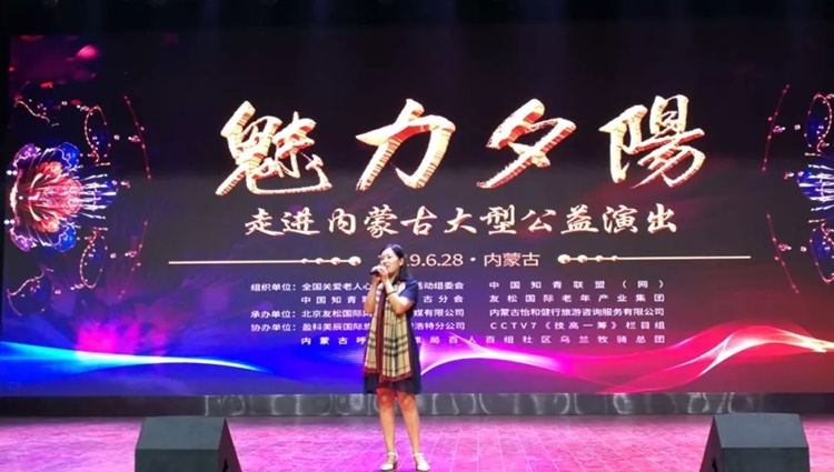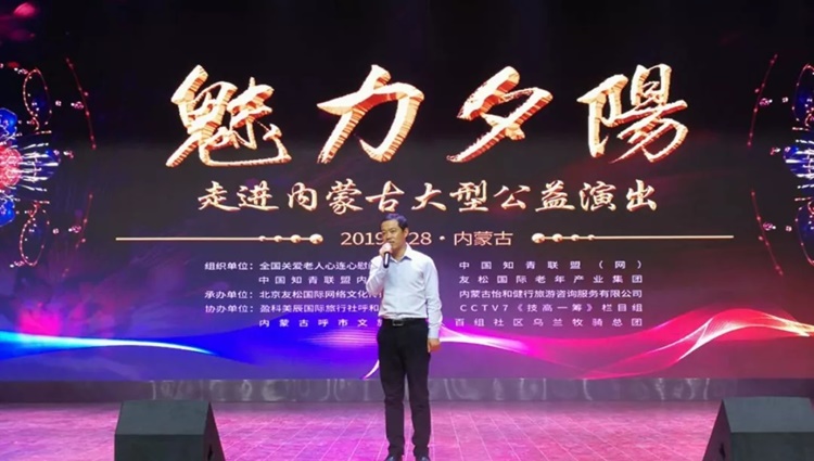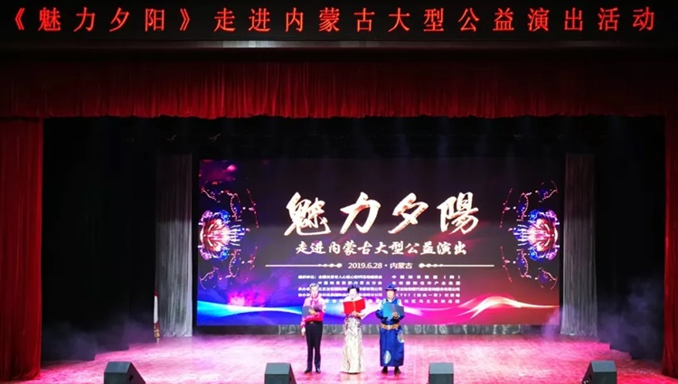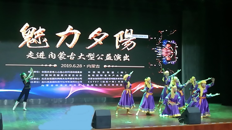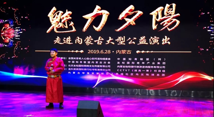为了庆祝中华人民共和国成立70周年,促进全国各省,市,自治区老年文化艺术交流,2019年6月28日,由全国关爱老人心连心慰问活动组委会、中国知青联盟(网)、中国知青联盟内蒙古分会、友松国际老年产业集团共同组织;北京友松国际网络文化传媒有限公司、内蒙古怡和健行旅游咨询服务有限公司承办;盈科美辰国际旅行社呼和浩特分公司、中央电视台第七频道《技高一筹》栏目组协办的《魅力夕阳-走进内蒙古大型公益演出》活动在内蒙古呼和浩特隆重举行!