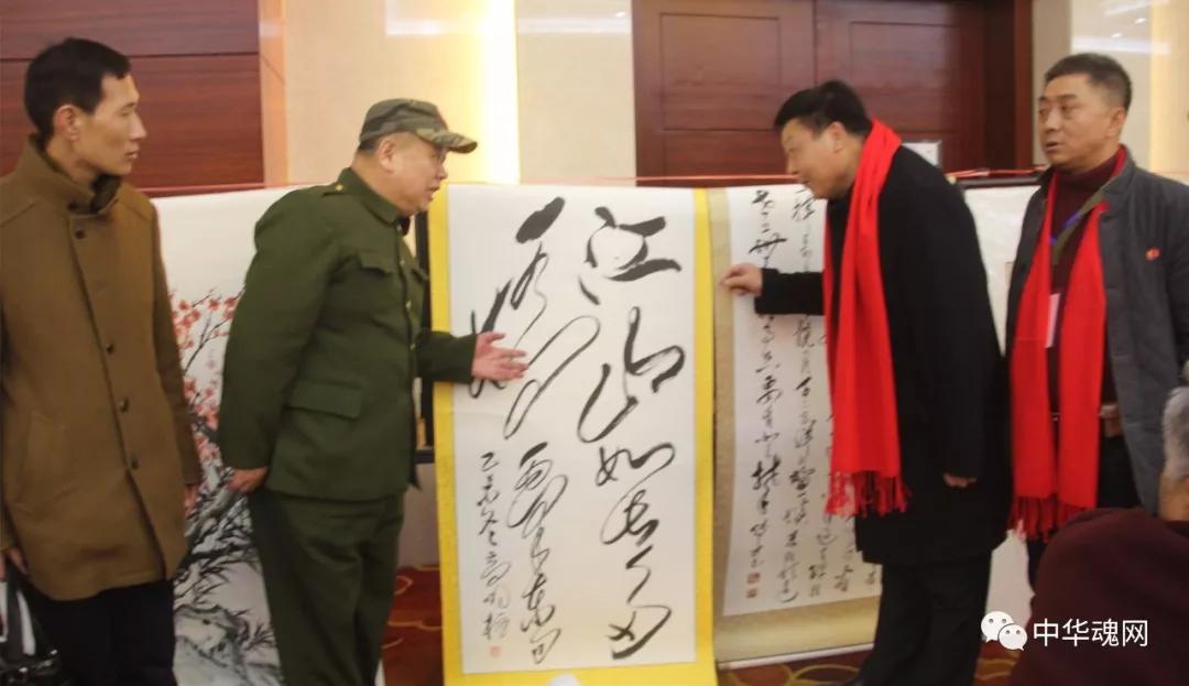 毛体书法家高明柱向组委会副主任赵地介绍他为本次纪念主席的书法作品