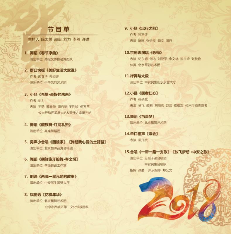 2018年1月27日19:00第二届百姓春晚在北京天桥艺术中心大剧场举行。晚会的出品人:李佳豪、何声扬。总策划:张铂永。总导演:王进江。总撰稿:陈太愚。总监制:张子龙。