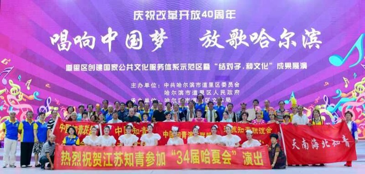 中国知青联盟江苏分会、江苏知青联谊会,及天南海北知青、陕西知青网、上海北大荒知青、北京知青、通化知青、哈尔滨、齐齐哈尔、佳木斯、牡丹江、长春、杭州等地的知青和演艺团队,聚集在中国知青演艺联盟旗帜下,在哈尔滨城市中心广场,成功地进行了第34届哈夏会知青专场的演出。同时,在满汉楼,举办了第12届天南海北知青大欢聚。