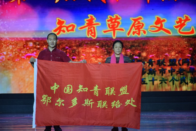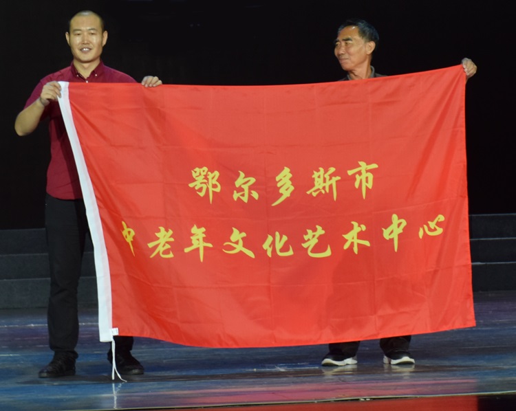 将鄂尔多斯市中老年文化艺术中心的旗帜交给彭宇。